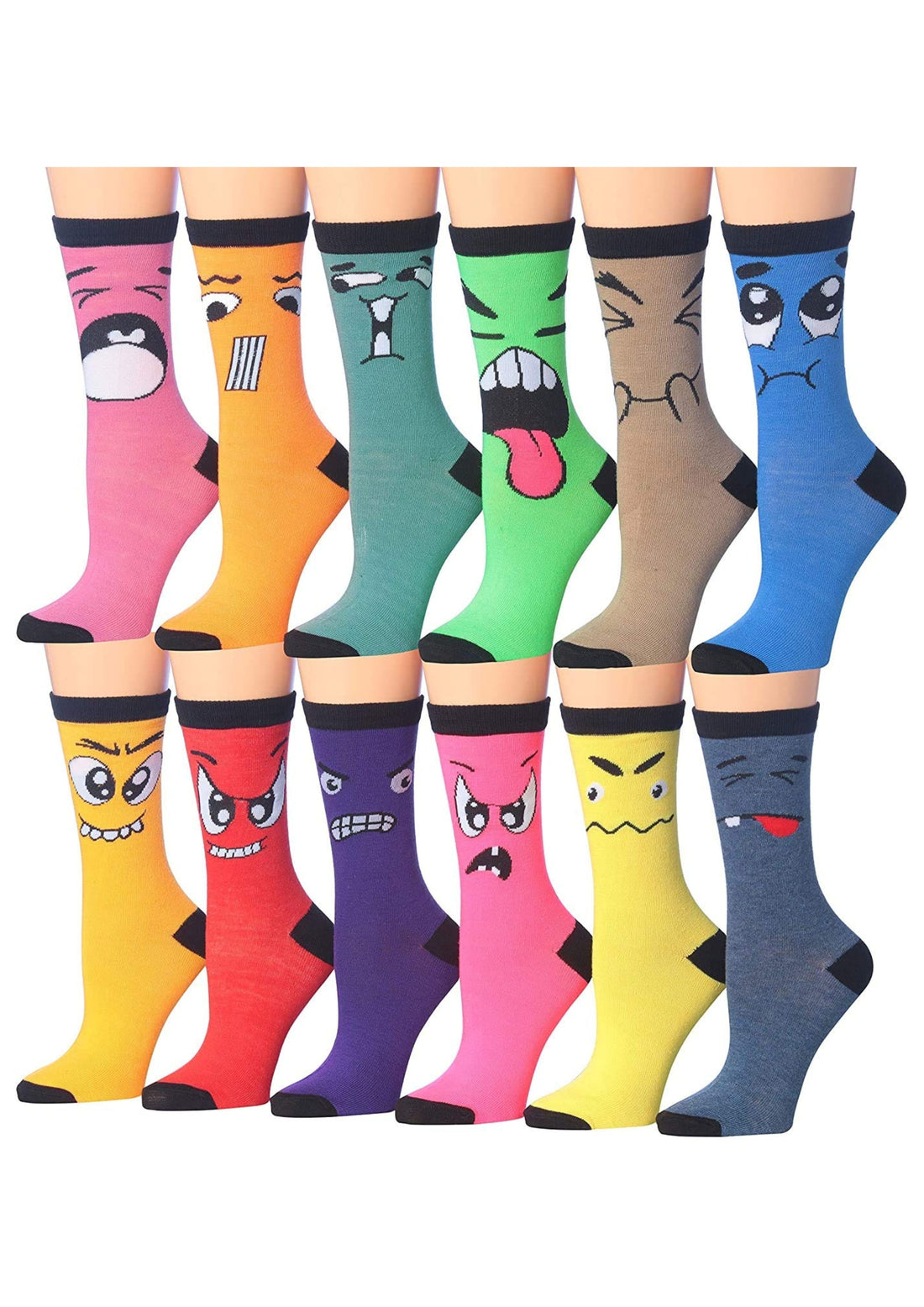 Women's 12 Pairs Lightweight Colorful Funny Crazy Face Patterned Crew