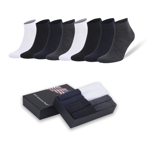 Stay comfortable and stylish with these Men's Bamboo Low Cut Ankle Socks, designed for daily casual wear. Made from a premium blend of bamboo fibers, these socks provide excellent breathability, moisture-wicking, and odor resistance to keep your feet cool, dry, and fresh all day. The seamless toe and reinforced heel ensure durability and all-day comfort, making these socks ideal for casual or business attire. Each package comes with 8 pairs of socks, elegantly packaged in a high-quality gift box, making it the perfect gift for fathers, brothers, or boyfriends. Designed to fit US men's shoe sizes 8-11.5, these bamboo socks offer superior comfort for any season. Machine washable for easy care.