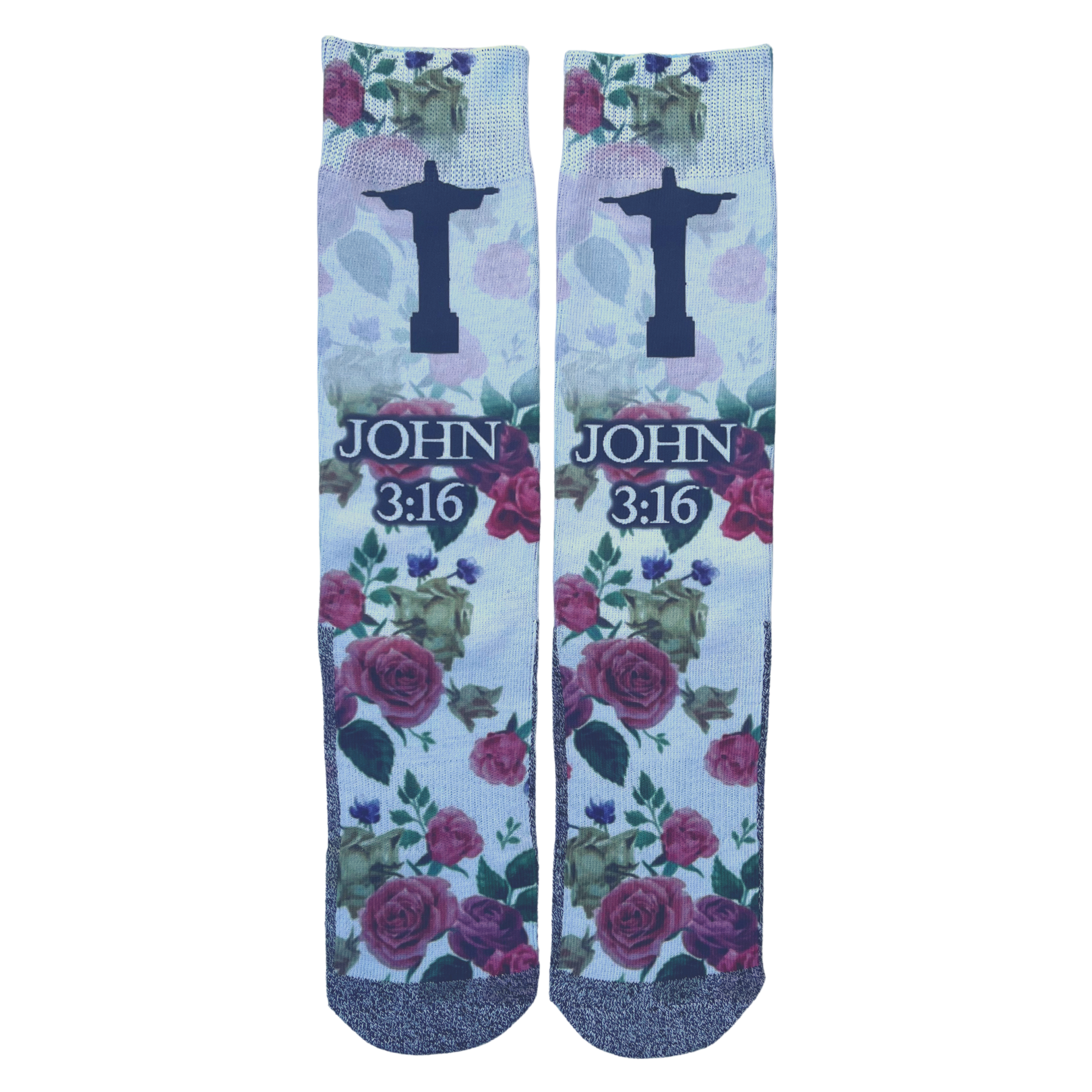 What might be the most famous Bible verse in the Christian world is now on a classy floral sock with a reminder of the loving outstretched arms of Jesus.