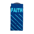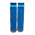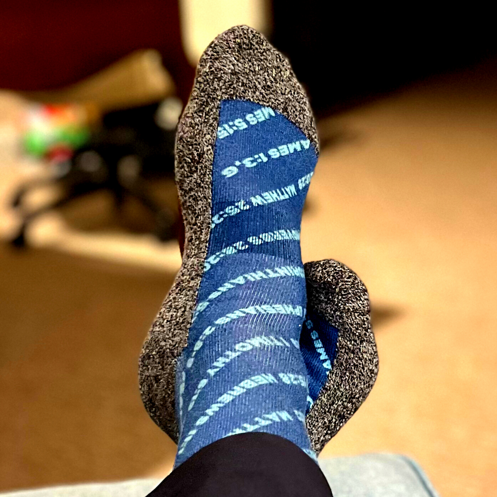 Some of the best Bible verses on Faith subtly make their way in turquoise stripes onto a navy blue sock ready to be read or taught at anytime.