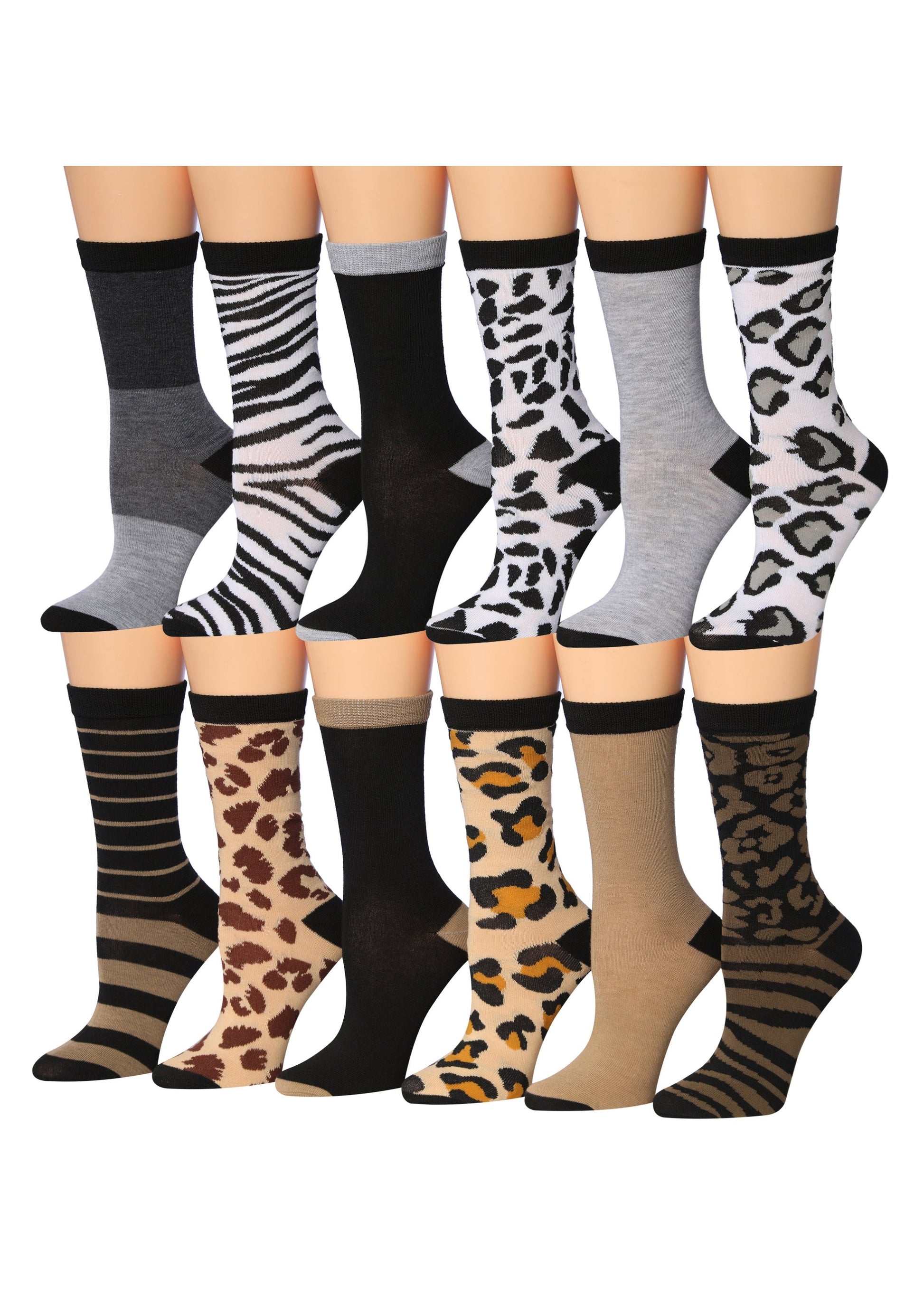 Women's 12 Pairs Lightweight Crew Socks – Black White & Brown Animal