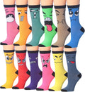 Women's 12 Pairs Lightweight Colorful Funny Crazy Face Patterned Crew