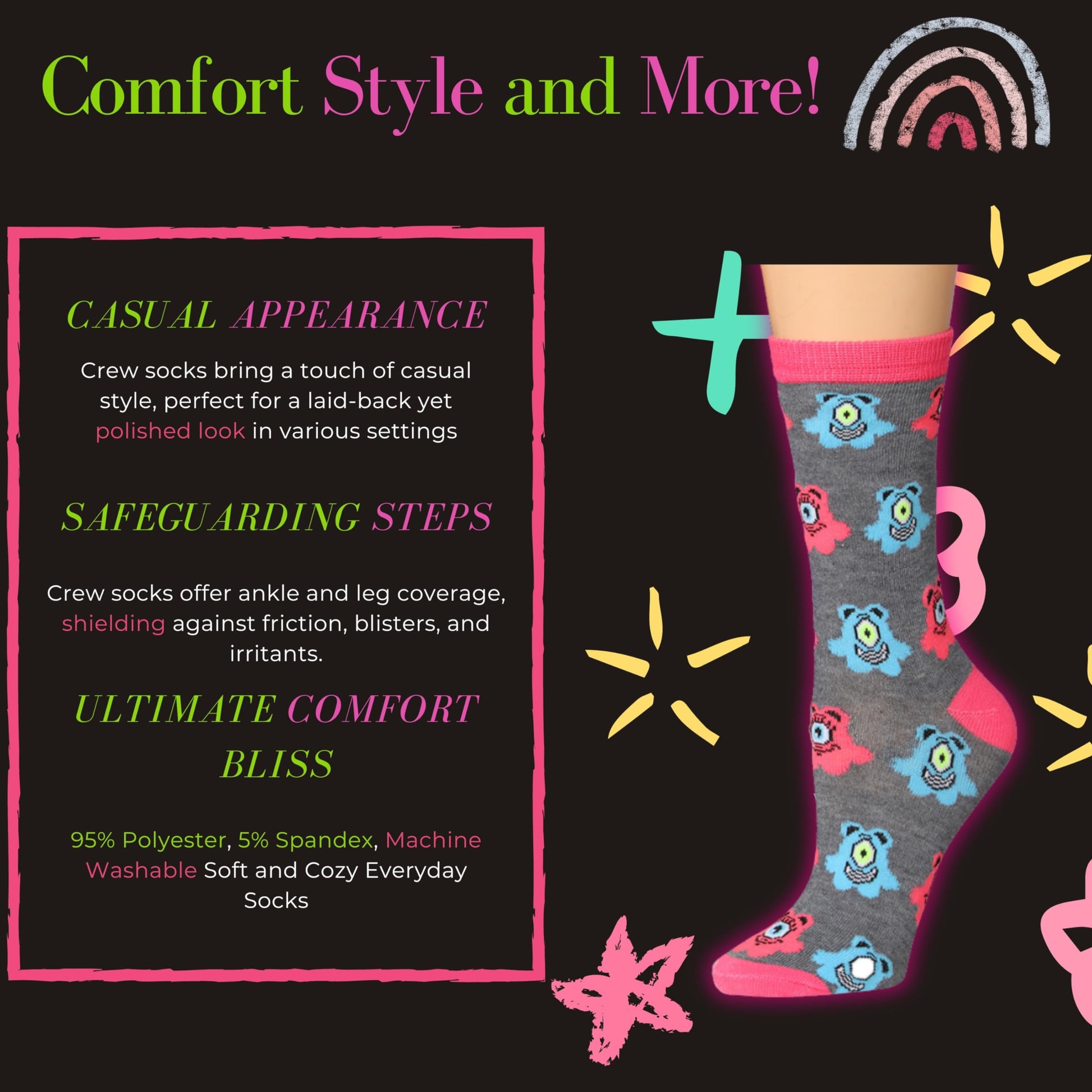 - Fun Socks for Every Occasion: With 6 pairs of vibrant patterned crew socks, you'll have the perfect pair for any event, adding joy and excitement to your everyday outfits.