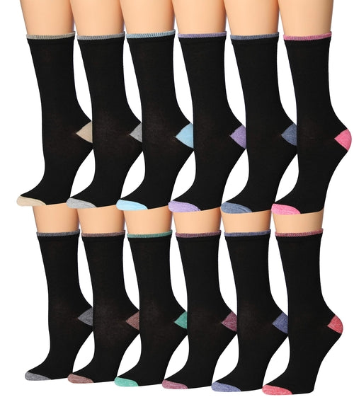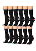 Women's 12-Pairs Lightweight Fun Plain Black Accented Toe Heel Colored